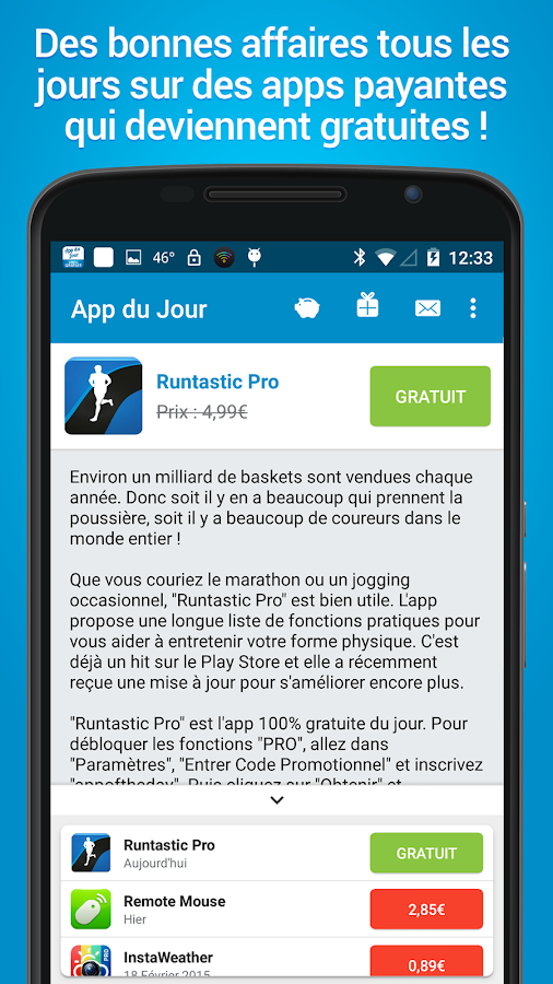 التطبيق متوفر على متجر جوجل بلاي يقوم بعرض التطبيقات المدفوعة ويوفر لك امكانية تحميل تطبيق مجاني كل يوم كما يعرض لك التطبيقات الفائتة وللدكر يوفر أحيانا العاب جميلة جدا بأسعار جيدة تصل الى خصم 90% ,للحصول على التطبيق إضغط هنا......